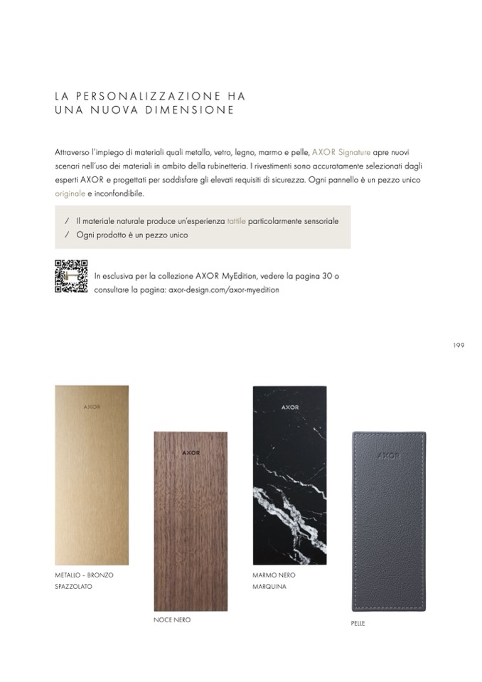 Attraverso l’impiego di materiali quali metallo, vetro, legno, marmo e pelle, AXOR Signature apre nuovi