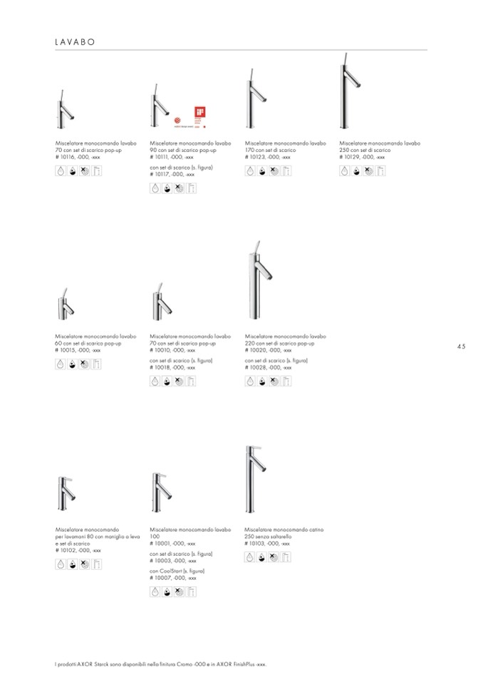 I prodotti AXOR Starck sono disponibili nella finitura Cromo -000 e in AXOR FinishPlus -xxx.