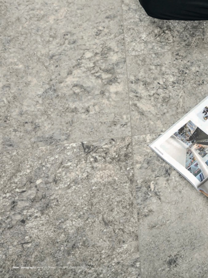 floor: plimagray/02 matte ptv 30x60 114/5”x235/8”. 60x60 235/8”x235/8”