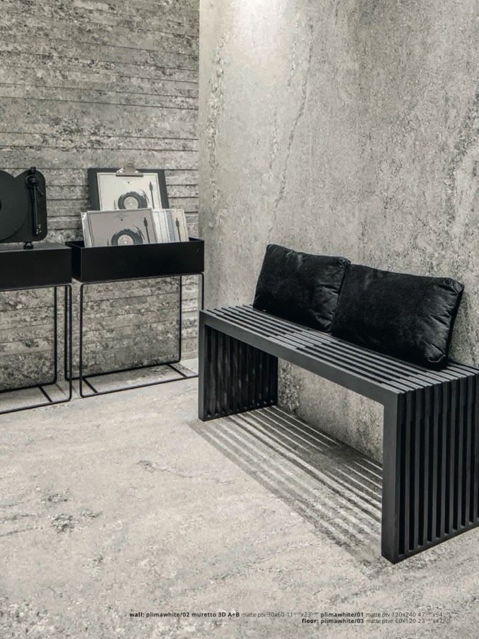 wall: plimawhite/02 muretto 3D A+B matte ptv 30x60 114/5”x235/8” plimawhite/01 matte ptv 120x240 471/4”x941/2”