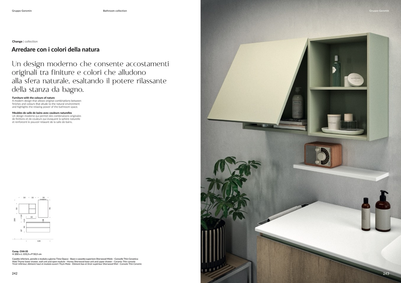 Casetto inferiore, pensile e modulo a giorno Timo Opaco - Base e cassetto superiore Sherwood Miele - Consolle Thin Ceramica