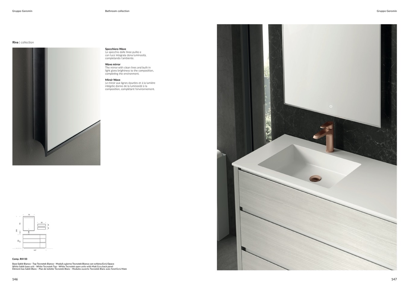 Élément bas Sablè Blanc - Plan de toilette Tecnotek Blanc - Modules ouverts Tecnotek Blanc avec fond Ecrù Mate