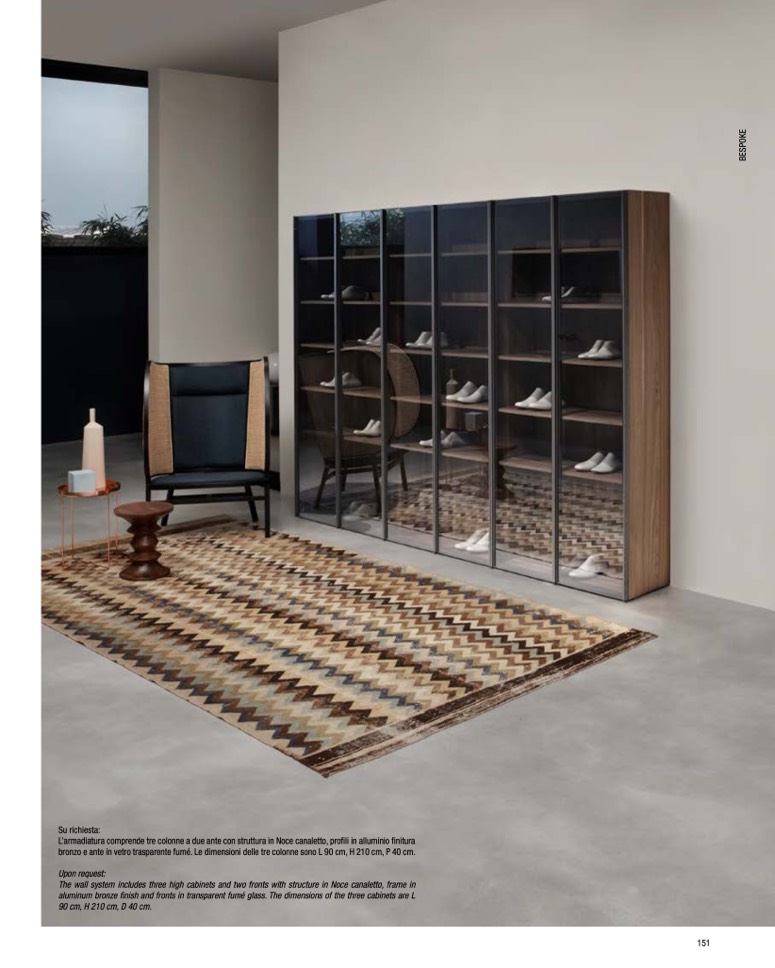 L’armadiatura comprende tre colonne a due ante con struttura in Noce canaletto, profili in alluminio finitura