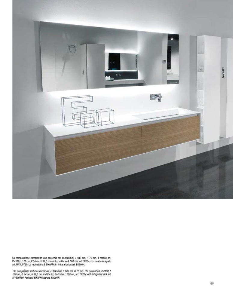 The composition includes mirror art. FLASH75W, L 180 cm, H 75 cm. The cabinet art. PI4180, L