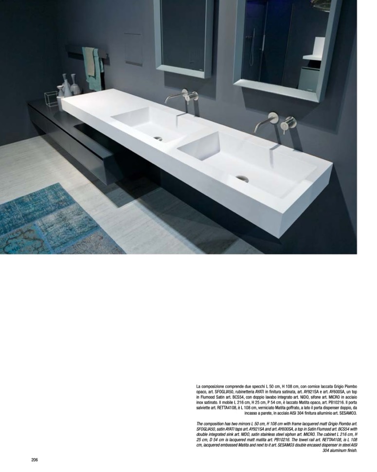 in Flumood Satin art. BCS54, con doppio lavabo integrato art. NIDO, sifone art. MICRO in acciaio
