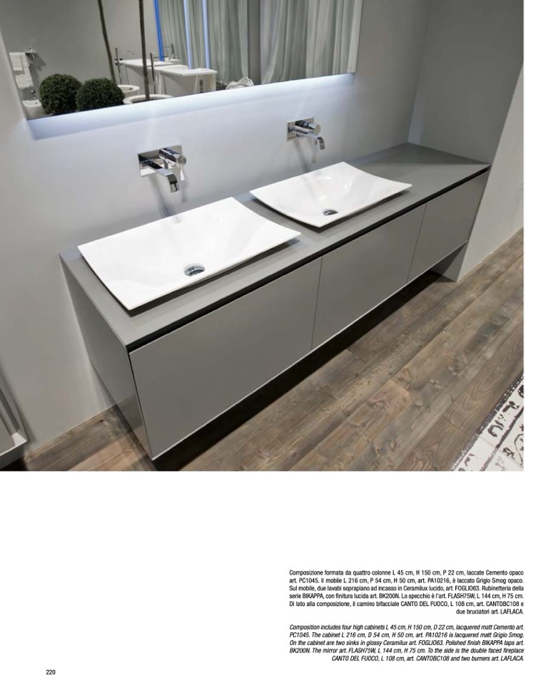 On the cabinet are two sinks in glossy Ceramilux art. FOGLIO63. Polished finish BIKAPPA taps art.