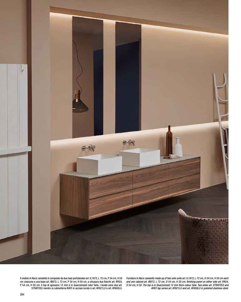 P 54 cm, H 50 cm. Il top di spessore 12 mm è in Quarzomood color Seta. I lavabi sono due art.