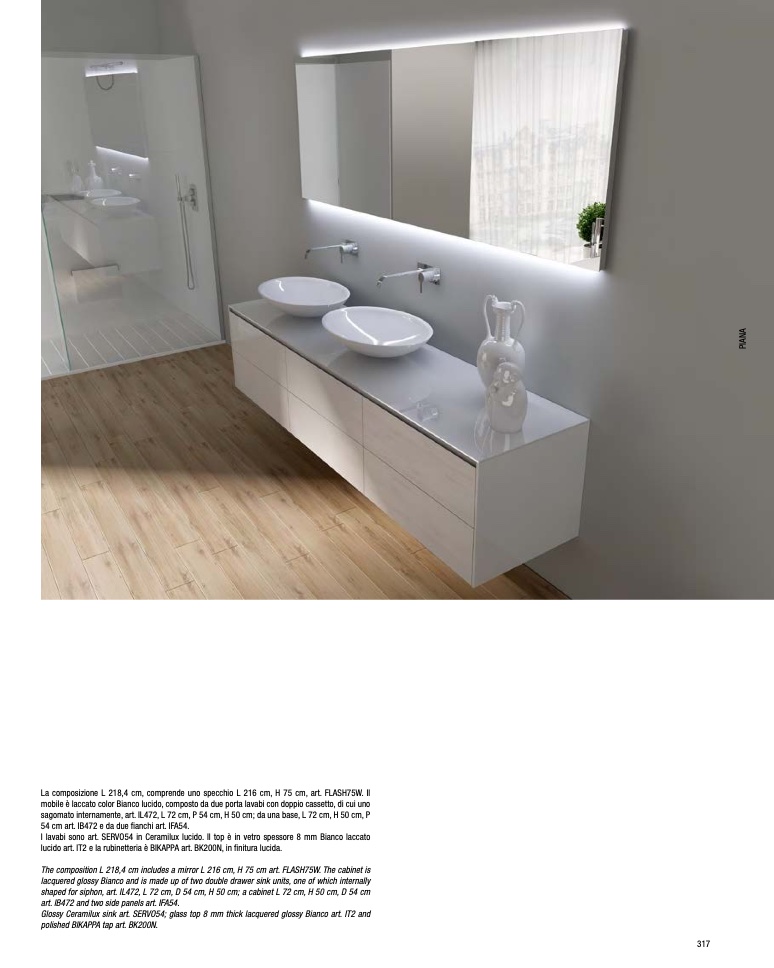 The composition L 218,4 cm includes a mirror L 216 cm, H 75 cm art. FLASH75W. The cabinet is