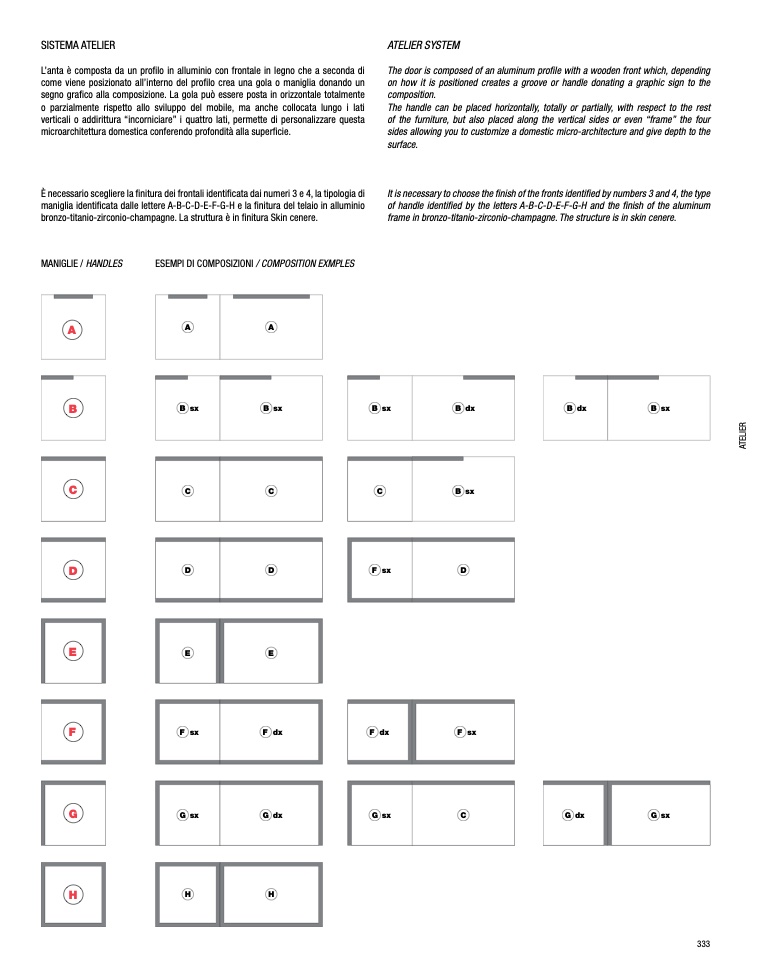 maniglia identificata dalle lettere A-B-C-D-E-F-G-H e la finitura del telaio in alluminio
