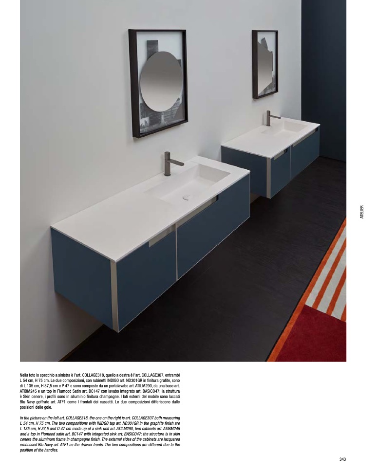 L 54 cm, H 75 cm. Le due composizioni, con rubinetti INDIGO art. ND301GR in finitura grafite, sono