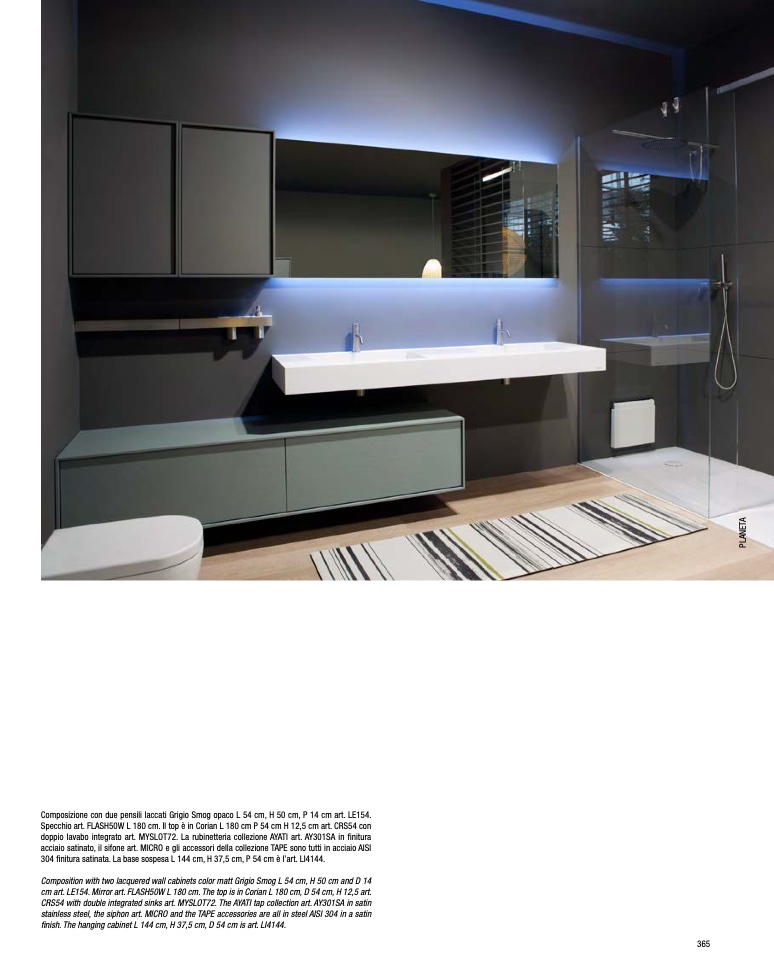 cm art. LE154. Mirror art. FLASH50W L 180 cm. The top is in Corian L 180 cm, D 54 cm, H 12,5 art.