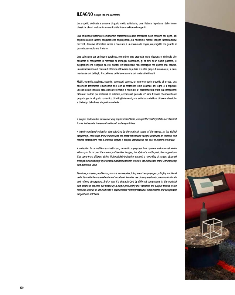 Furniture, consoles, wall lamps, mirrors, accessories, tubs, a real design project, a highly emotional