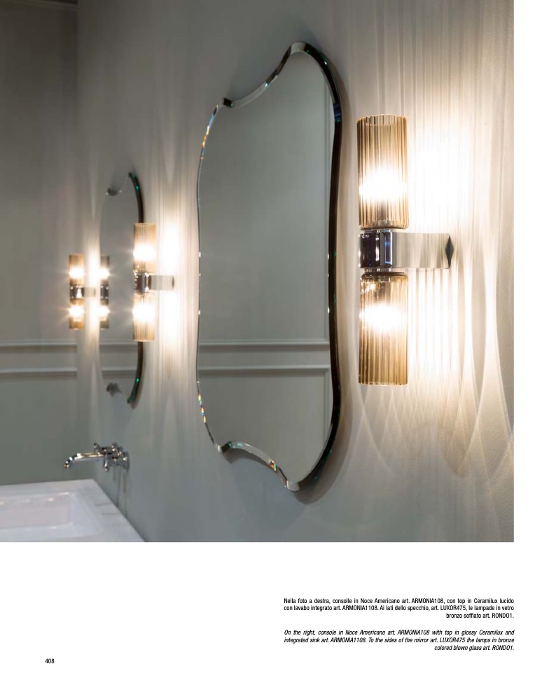 integrated sink art. ARMONIA1108. To the sides of the mirror art. LUXOR475 the lamps in bronze