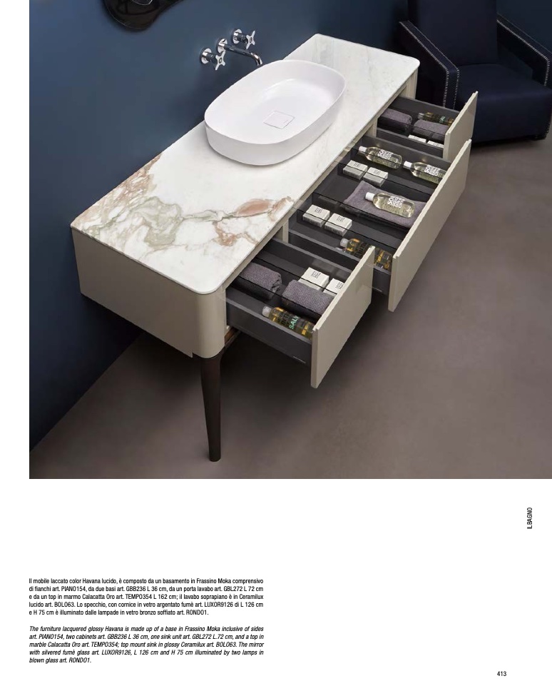 marble Calacatta Oro art. TEMPO354; top mount sink in glossy Ceramilux art. BOLO63. The mirror