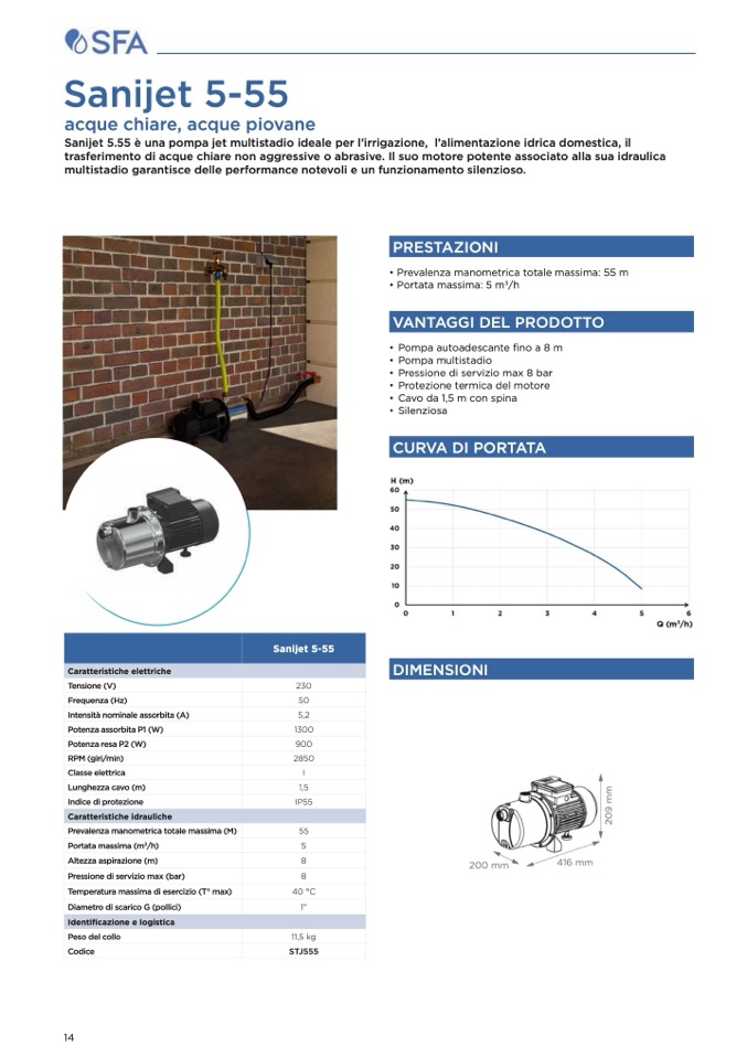 Sanijet 5.55 è una pompa jet multistadio ideale per l’irrigazione, l’alimentazione idrica domestica, il