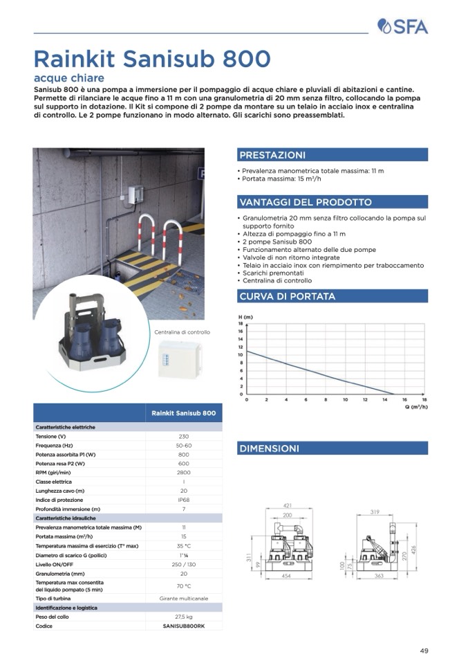 Permette di rilanciare le acque fino a 11 m con una granulometria di 20 mm senza filtro, collocando la pompa