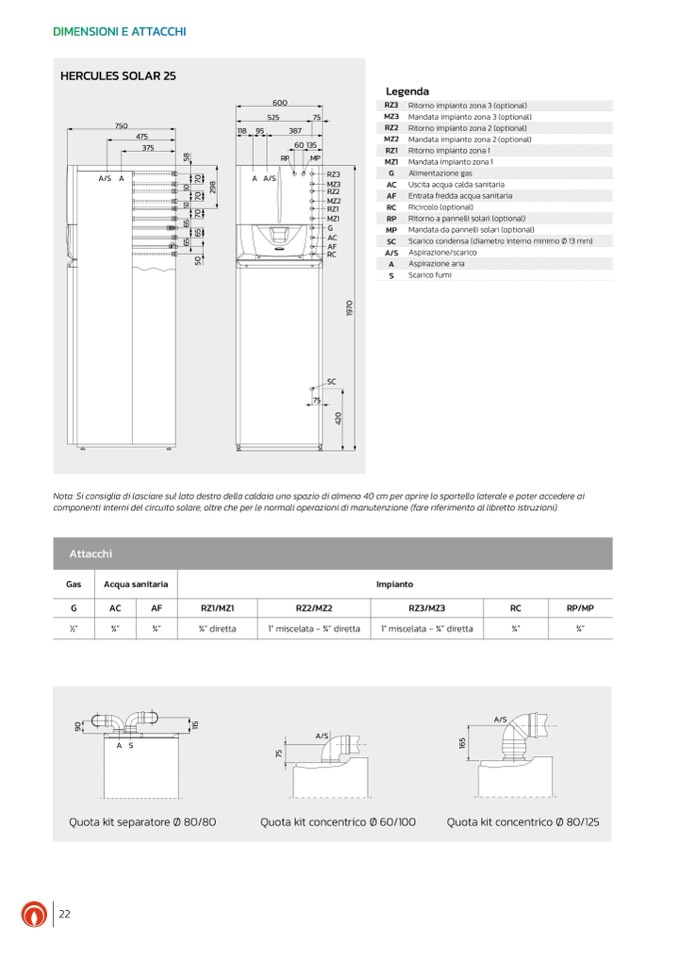Nota: Si consiglia di lasciare sul lato destro della caldaia uno spazio di almeno 40 cm per aprire lo sportello laterale e poter accedere ai