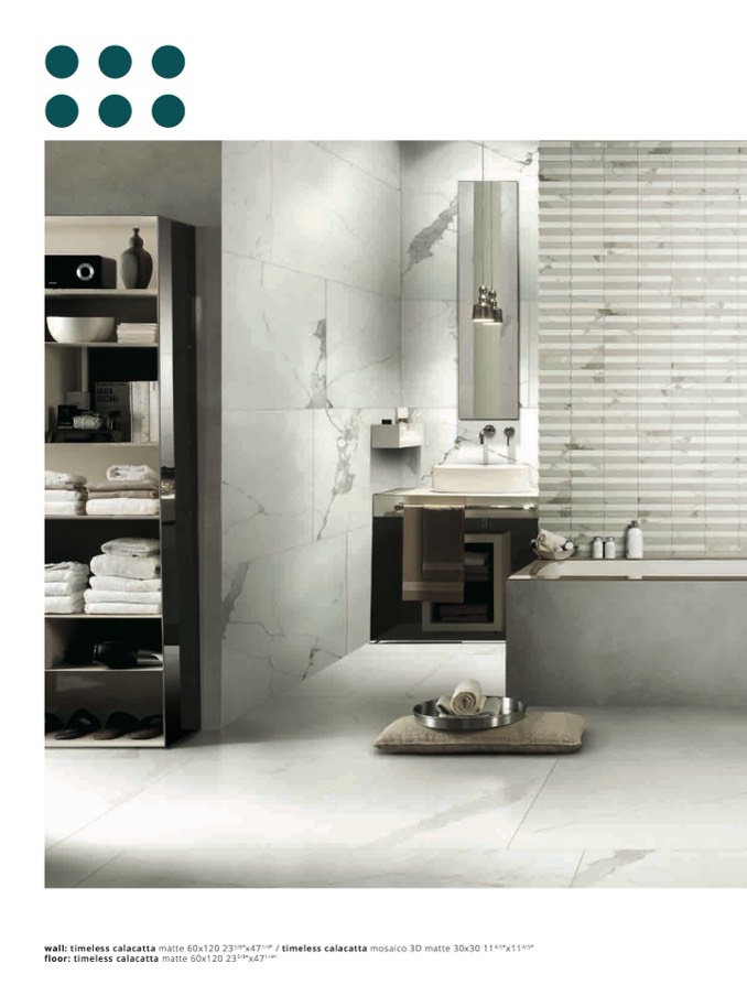 wall: timeless calacatta matte 60x120 235/8”x471/4” / timeless calacatta mosaico 3D matte 30x30 114/5”x114/5