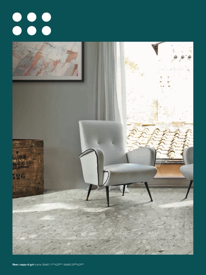 floor: ceppo di grè matte 30x60 114/5”x235/8” / 60x60 235/8”x235/8”