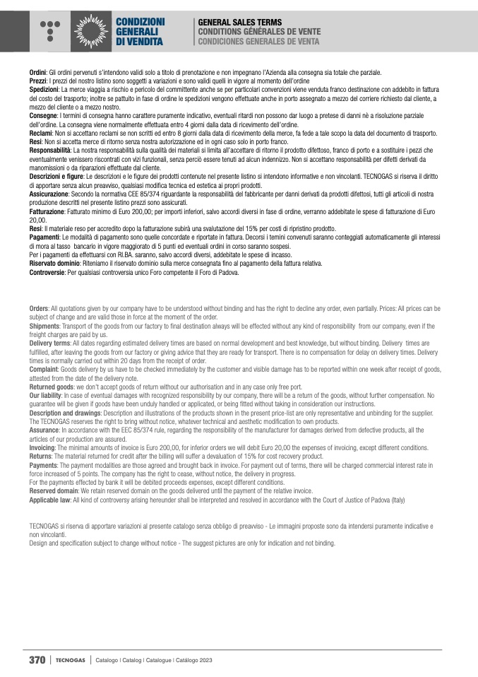 Descrizioni e figure: Le descrizioni e le figure dei prodotti contenute nel presente listino si intendono informative e non vincolanti. TECNOGAS si riserva il diritto
