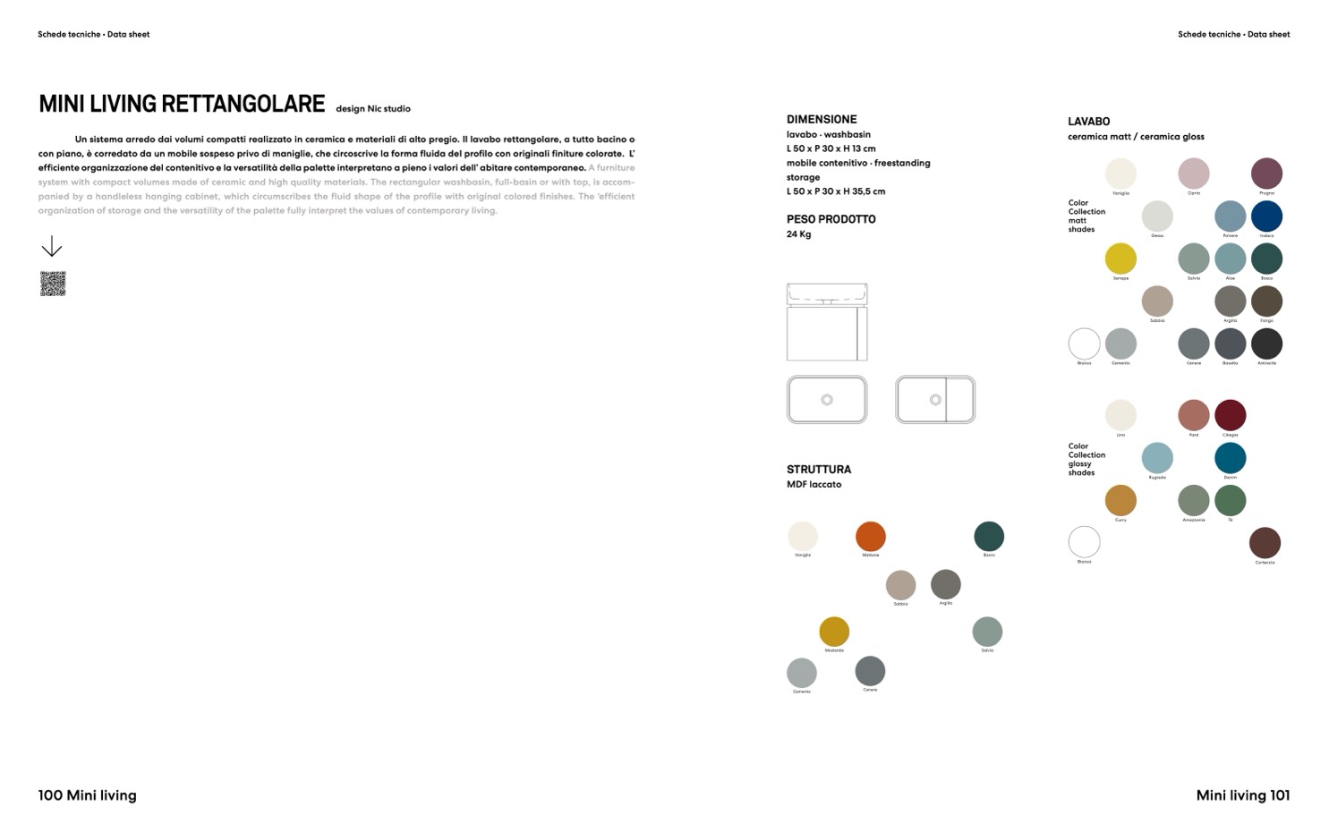 system with compact volumes made of ceramic and high quality materials. The rectangular washbasin, full-basin or with top, is accom-